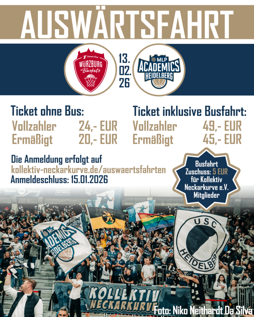 Ludwigsburg, 03.01.2026, Tip-off 20:00 Uhr: Die Anmeldefrist endete am 27.11.2025. Der Bus fährt. Wenn ihr Euch angemeldet habt, erhaltet ihr per Mail die genauen Informationen zu dieser Auswärtsfahrt.